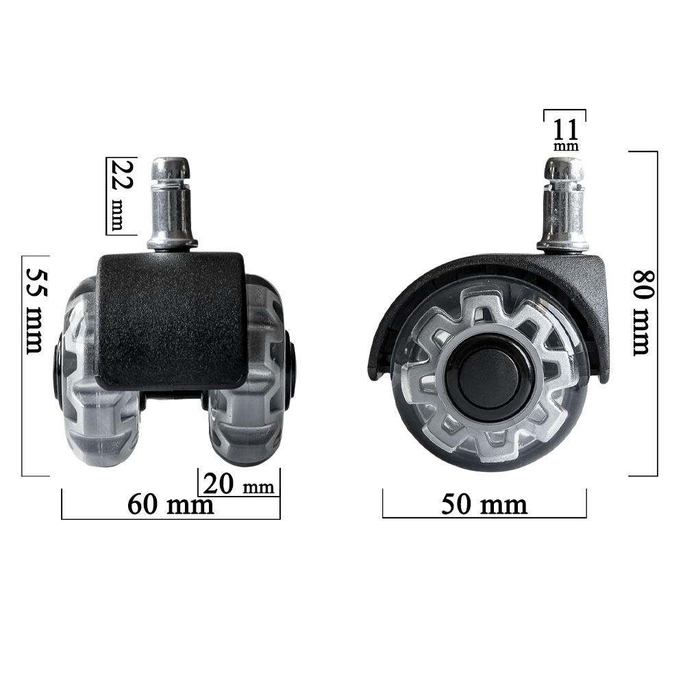 Prinderea este universală, cu o tijă standard de 11 mm diametru și 22 mm înălțime, compatibilă cu majoritatea scaunelor de birou disponibile pe piață. Aceste role reprezintă o soluție simplă și eficientă pentru înlocuirea celor uzate sau pentru upgrade-ul complet al scaunului tău.