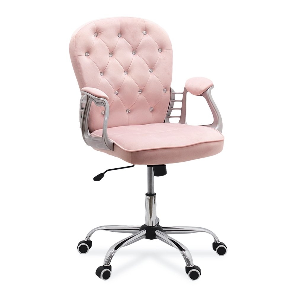 Baza cu cinci brațe realizate din metal cromat, fiecare cu o roată cauciucată neagră, asigură mobilitatea și ușurința deplasării pe diferite suprafețe. Indiferent dacă petreceți ore întregi la birou sau doriți să transformați aspectul spațiului de lucru, acest scaun de birou din catifea roz reprezintă alegerea ideală pentru a vă oferi confort, funcționalitate și un plus de stil în fiecare zi.