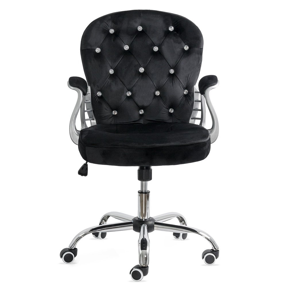 Îmbrăcat într-un material textil negru de înaltă calitate, acest scaun emană eleganță și rafinament. Textura fină a materialului oferă o senzație plăcută la atingere, iar designul capitonat adaugă un aspect de lux.