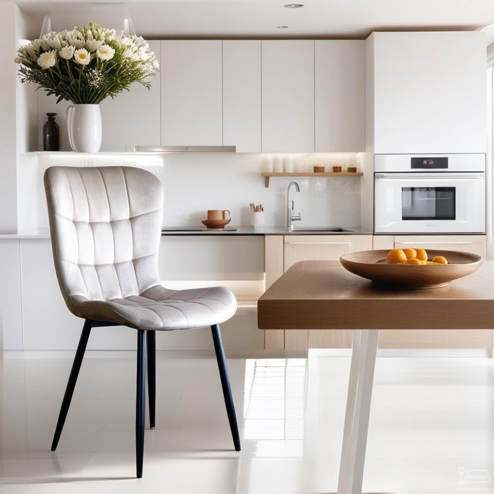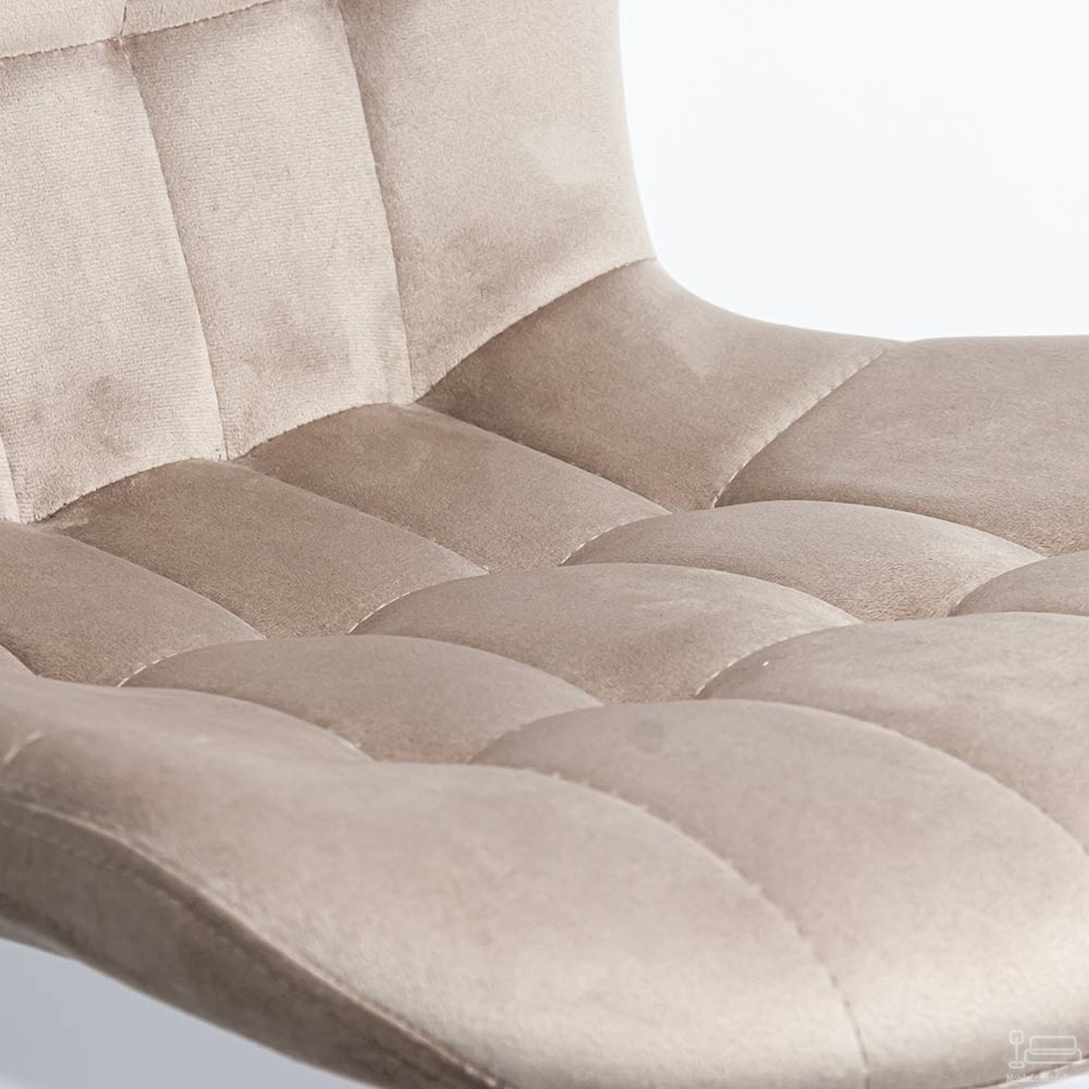 Catifeaua de pluș, într-o nuanță caldă și reconfortantă de bej, conferă fiecărui centimetru al acestui scaun o notă de rafinament și lux. Designul ergonomic, cu spătar ușor curbat și margini rotunjite, asigură confortul desăvârșit pentru ore întregi de relaxare sau socializare.