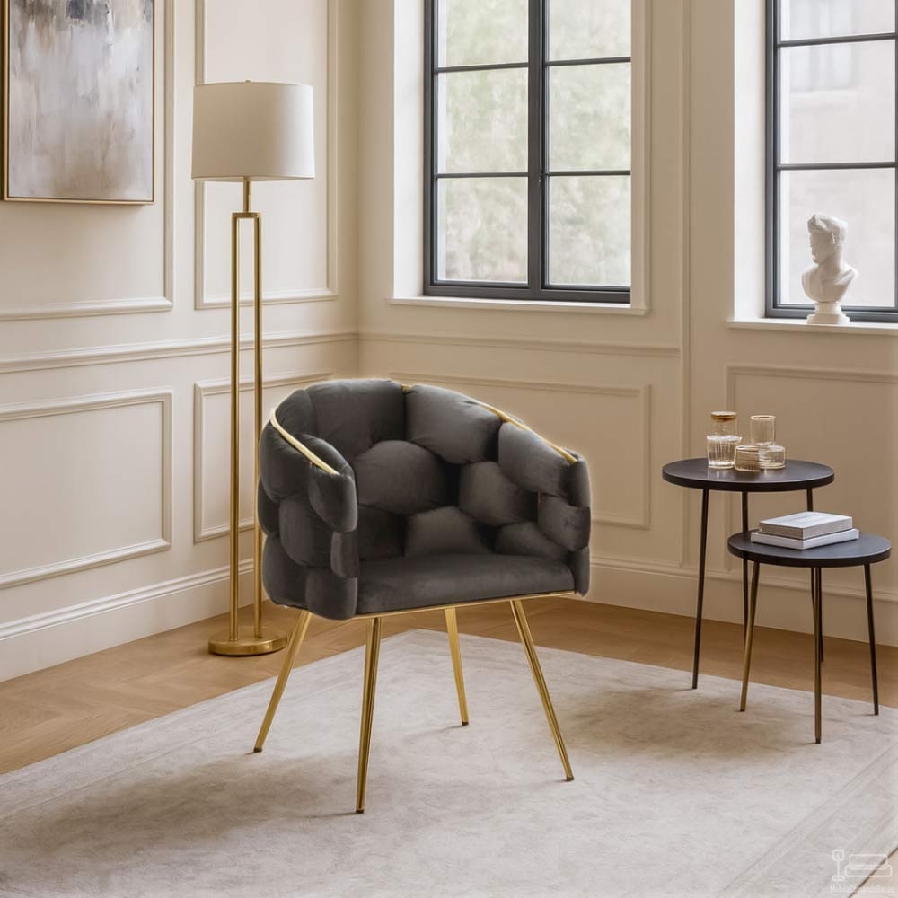 Baza metalică auriu satinat oferă un contrast elegant și sprijină forma solidă a șezutului. Fiecare picior este prevăzut cu piciorușe reglabile, care oferă stabilitate indiferent de tipul podelei. Liniile fluide, spătarul curbat și tapițeria moale transformă acest model într-o alegere plăcută pentru zona de zi sau dining.