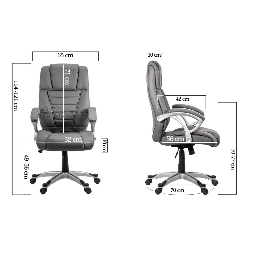 Dimensiunile generoase ale scaunului includ o înălțime minimă de 114 cm și maximă de 121 cm, măsurată de la nivelul solului până la cel mai înalt punct, un șezut cu o adâncime de 56 cm și o lățime de 52 cm. Înălțimea de la nivelul solului până la șezut este reglabilă între 49 și 56 cm, oferindu-vă posibilitatea de a personaliza scaunul pentru a se potrivi nevoilor dvs.
